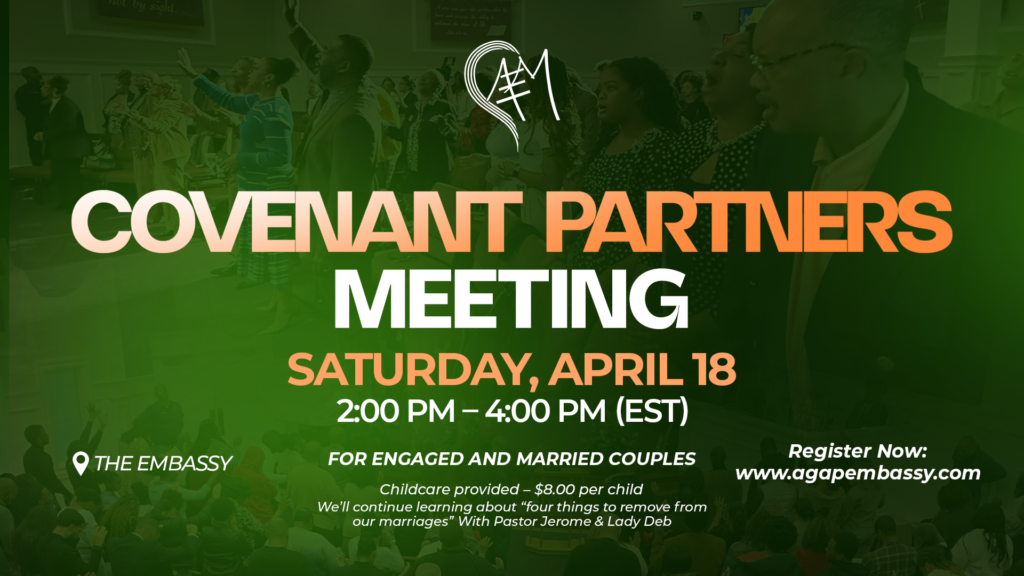 Agape Embassy Ministries invites engaged and married couples to join us for our Covenant Partners Meeting on Saturday, April 18 from 2:00 to 4:00 PM at The Embassy. This intentional gathering is designed to strengthen relationships through biblical teaching, honest conversation, and practical tools for building healthy, lasting marriages. Together with Pastor Jerome and Lady […]